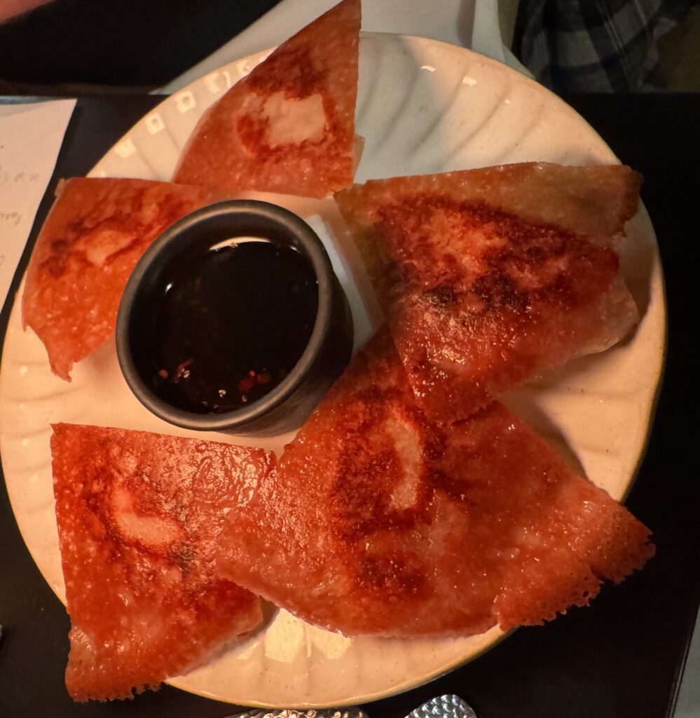 We followed this up with the crispy pork gyoza with soy-vinegar dip. The filling was perfectly spiced with a touch of heat: it did not descend into mono flavor like take out. We loved all of the textures. The filling was ALMOST loose, but it cohered. They let the crispy excess gyoza-bottom just spread out, which was crispy and delightful. That being said the shape sort of confused several Rouletters and they weren’t really sure if they liked it. ⭐️ 3.9 ⭐️